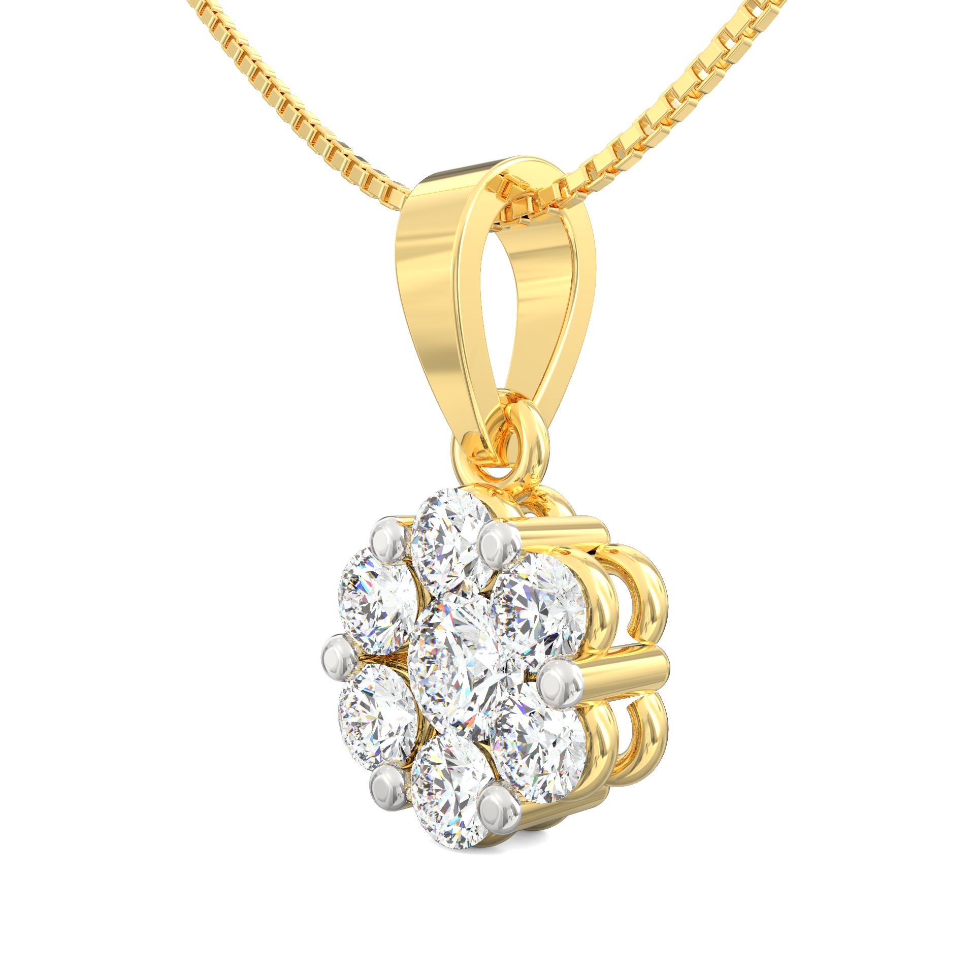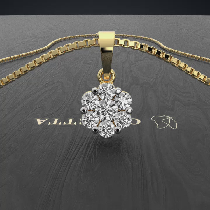 This floral-inspired pendant brings together elegance and lightness in one graceful design. Seven lab-grown diamonds—six forming delicate petals and one shining center—create a blooming silhouette that sparkles with every movement. The raised central stone adds depth, while the 18K Micron Plated Yellow Gold brings rich warmth to the polished surface.
