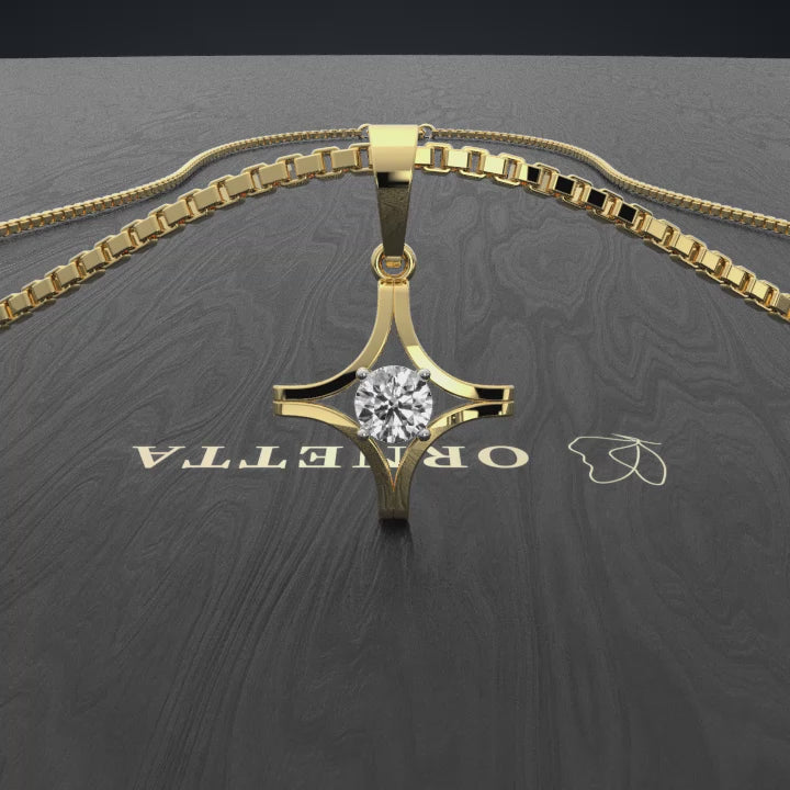 This pendant celebrates simplicity with a bold heart. The geometric star-inspired frame is crafted to direct all eyes to the brilliant round-cut solitaire diamond at its center. With clean symmetry and a powerful silhouette, this piece reflects clarity, strength, and focus. The 18K Micron Plated finish adds a layer of warmth and timeless elegance.